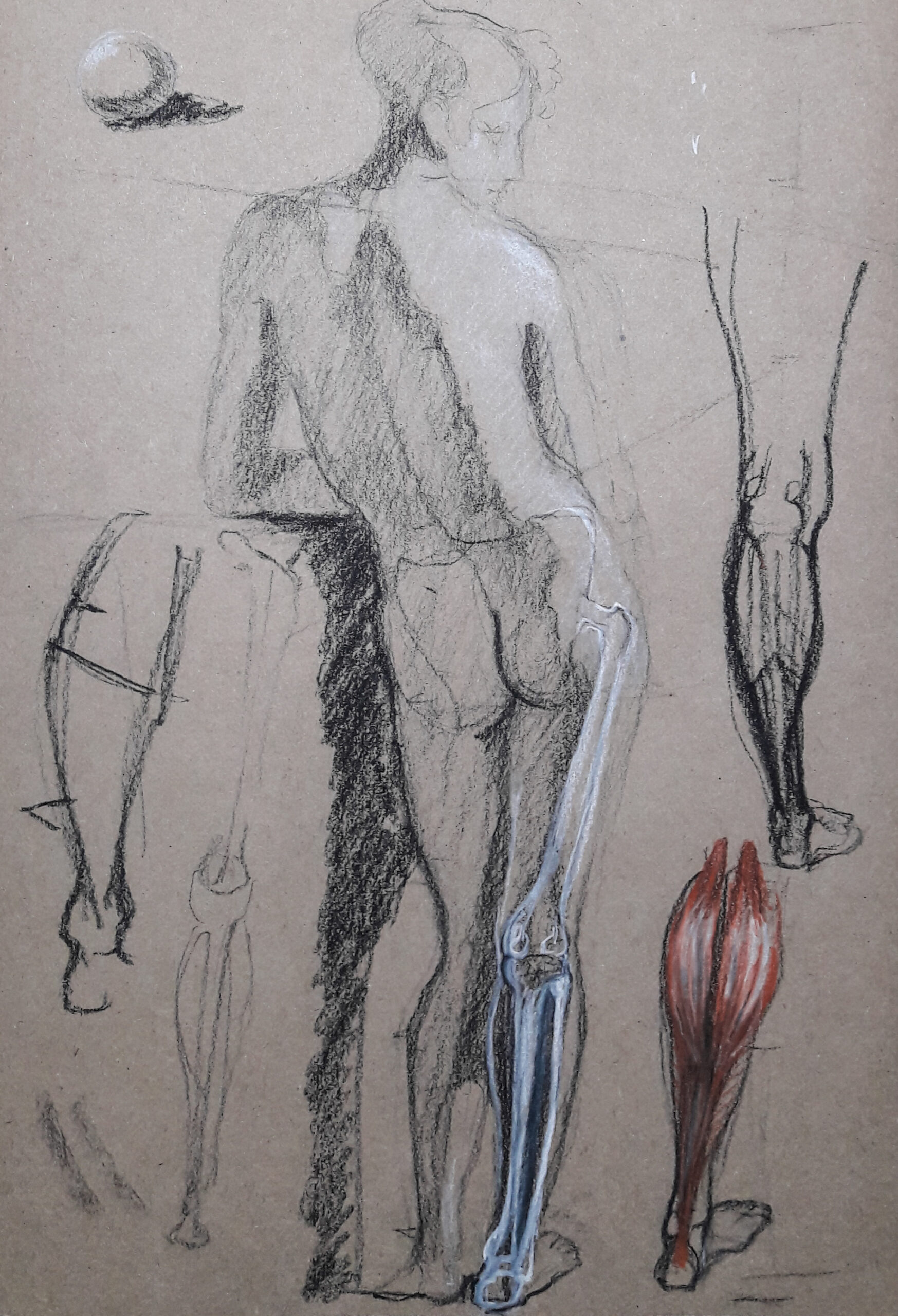 Les journées seront consacrées à l’utilisation d’outils spécifiques ou de leurs combinaisons : crayon, fusain, sanguine, craie blanche et pierre noire, ainsi que les techniques des trois crayons et du pastel. Les matinées seront dédiées à l’apprentissage de la technique par le dessin d’après une reproduction d’œuvre. Nous aborderons une chapitre de la morphologie illustré par l’œuvre afin de comprendre les repères anatomiques et de pouvoir appliquer ces connaissances sur le dessin de modèle vivant.